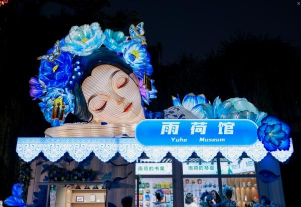 The museum takes inspiration from the fictional character Xia Yuhe. Above its entrance, an installation shows Xia Yuhe as a serene maiden by the lake, adorned with hairpins and lotus flowers, resting in quiet repose.