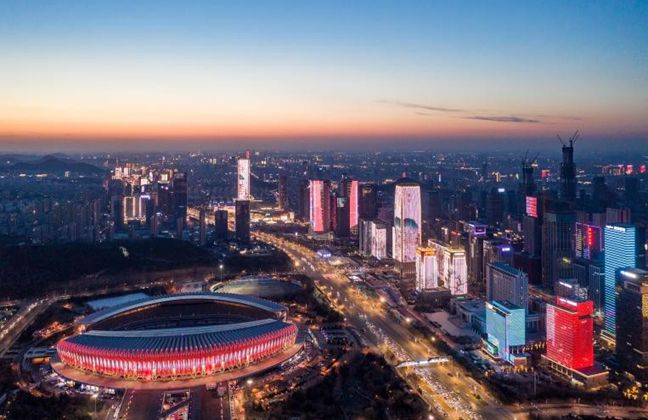 The illuminated skyline of Lixia's Central Business District. [Photo/VCG]