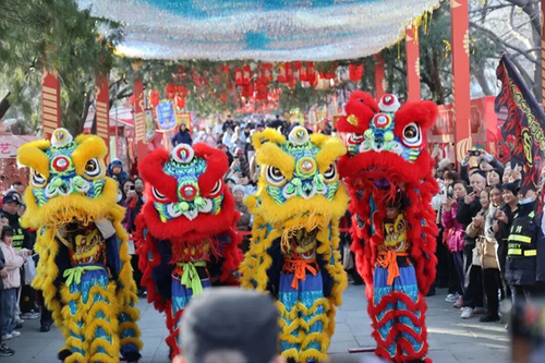 Performers stage a spectacular lion dance at a bustling Spring Festival temple fair in Lixia district. [Photo/WeChat account: lixiatoutiao]